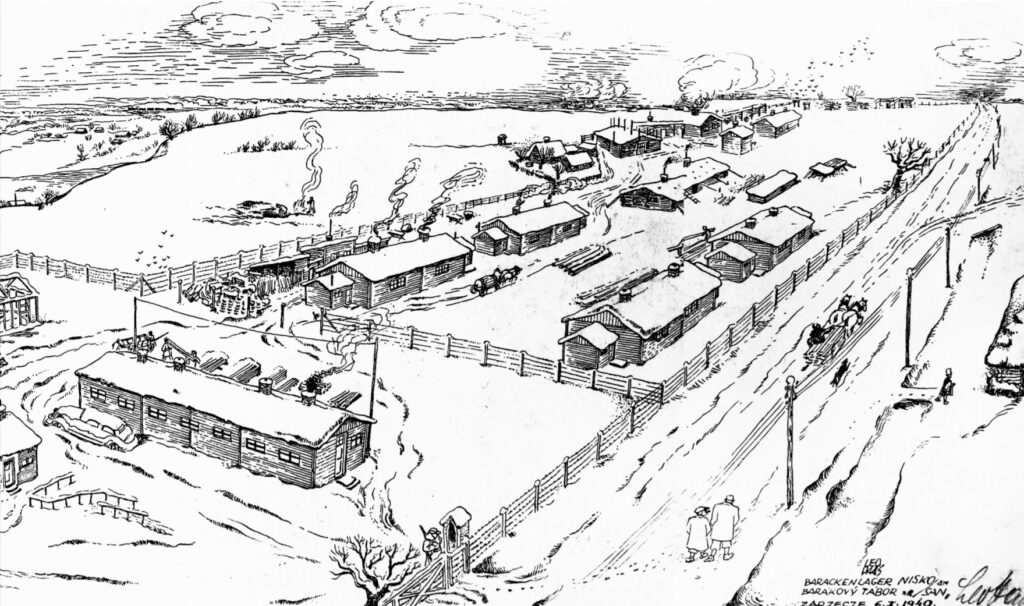 אני באתי כבנאי. תוך כמה דקות הופיע לפנינו אדולף אייכמן… הוא דיבר בקיצור רב ונתן לנו הוראות קפדניות כיצד להקים מחנה. הוא הדגיש את עמדת המגדל והשמירה באמצע המחנה. הוא אמר כי יש לבנות מגדל שמירה (Maschinengewehrturm) באמצע המחנה. מצד שני, הוא הורה לרופאים שאסור שתהיה מגיפה. (…) זה ממוקם כ-7 ק"מ מניסקו, מזרחית לסן, בכפר זרזצ'ה. אני יודע שלמחרת התחיל כל המחנה (הטרנספורט) וחולק לפי מקצוע. הנהלת המחנה (גסטפו) התעניינה רק בכמה בעלי מלאכה או בנאים, הדרושים להקמת המחנה ולתחזוקתו. החלק הנותר של הטרנספורט, יותר ממחציתו, הונע מזרחה לכיוון נהר בוק, קו הגבול דאז. כבנאי, נשארתי אז במחנה. מכיוון שבניתי את הצריף הראשון בכניסה עבור הגסטפו במחנה, ראיתי טרנספורטים אחרים עוברים לכיוון בוק, שלושה טרנספורטים מווינה, טרנספורט אחד משלזיה (טיסינסקו), מבילסקו וקטוביץ. היה גם טרנספורט קטן מאוסטרבה במספר של כ-200 איש. מתוך הטרנספורטים האלו, רק מספר קטן של גברים, כ-60, התקבל למחנה שלנו. גם במקרה זה היו אלה בעיקר בעלי מלאכה ש"המחנה היה זקוק להם ". האחרים המשיכו עם הטרנספורט בצעדה ובעיקר נספו. רק חלק קטן מהם ניצלו."